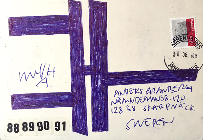 Over the last 20 years, I have mailed cards from all corners of the world to galleries, newspapers and museums in Sweden. The motifs are always different, but the message remains the same: "Allt förlöper fint" (In English: Doing fine) on the front side and "Mvh. A. Granberg" (Best Regards, A. Granberg) on the back.