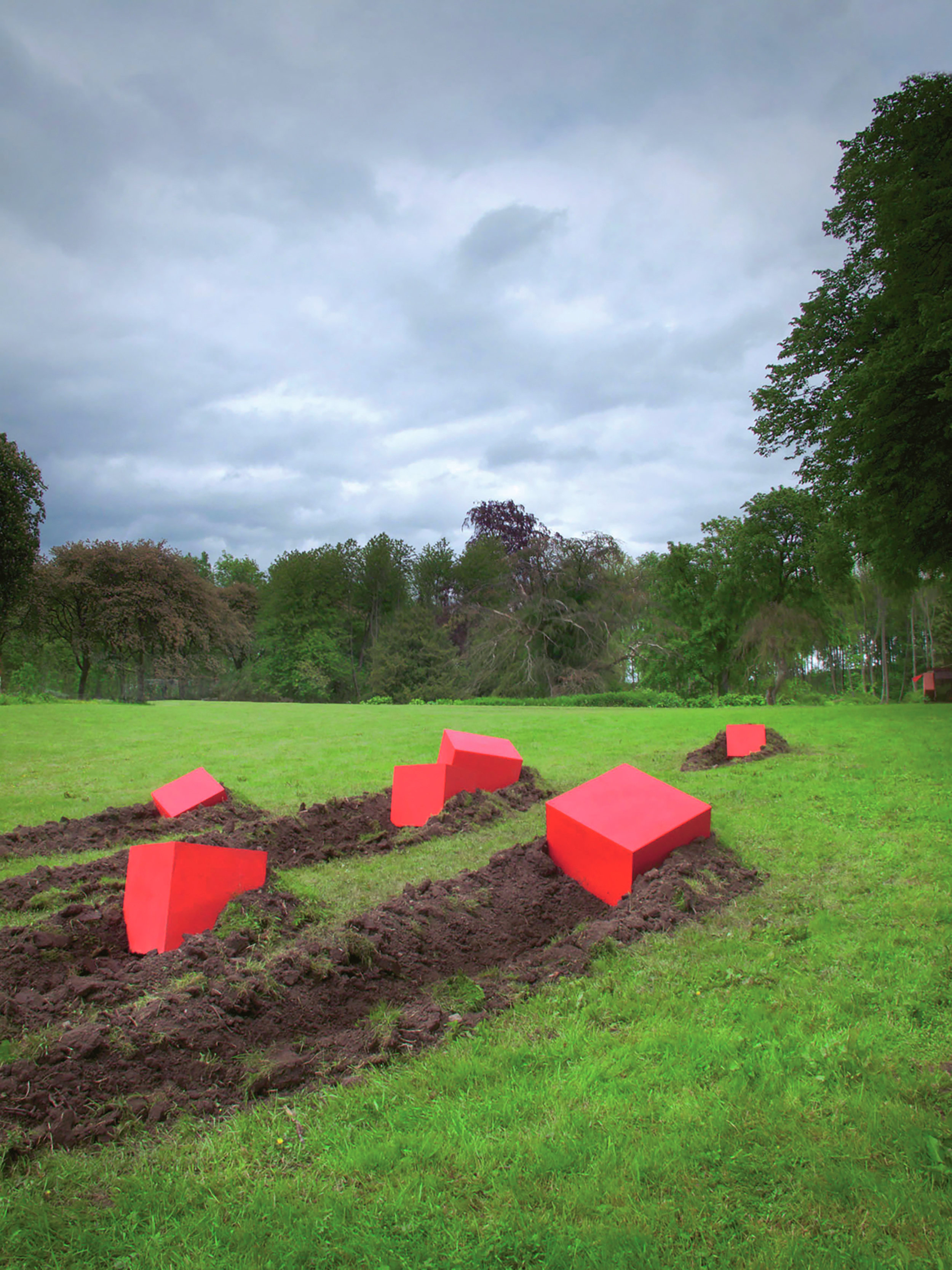 Three tons of red concrete hit the ground with great impact. This monumental sculpture was commissiond by Halmstads- and Sundsvalls municipality. Cubes was first exhibited at Marsvinsholms sculpture park 2009.